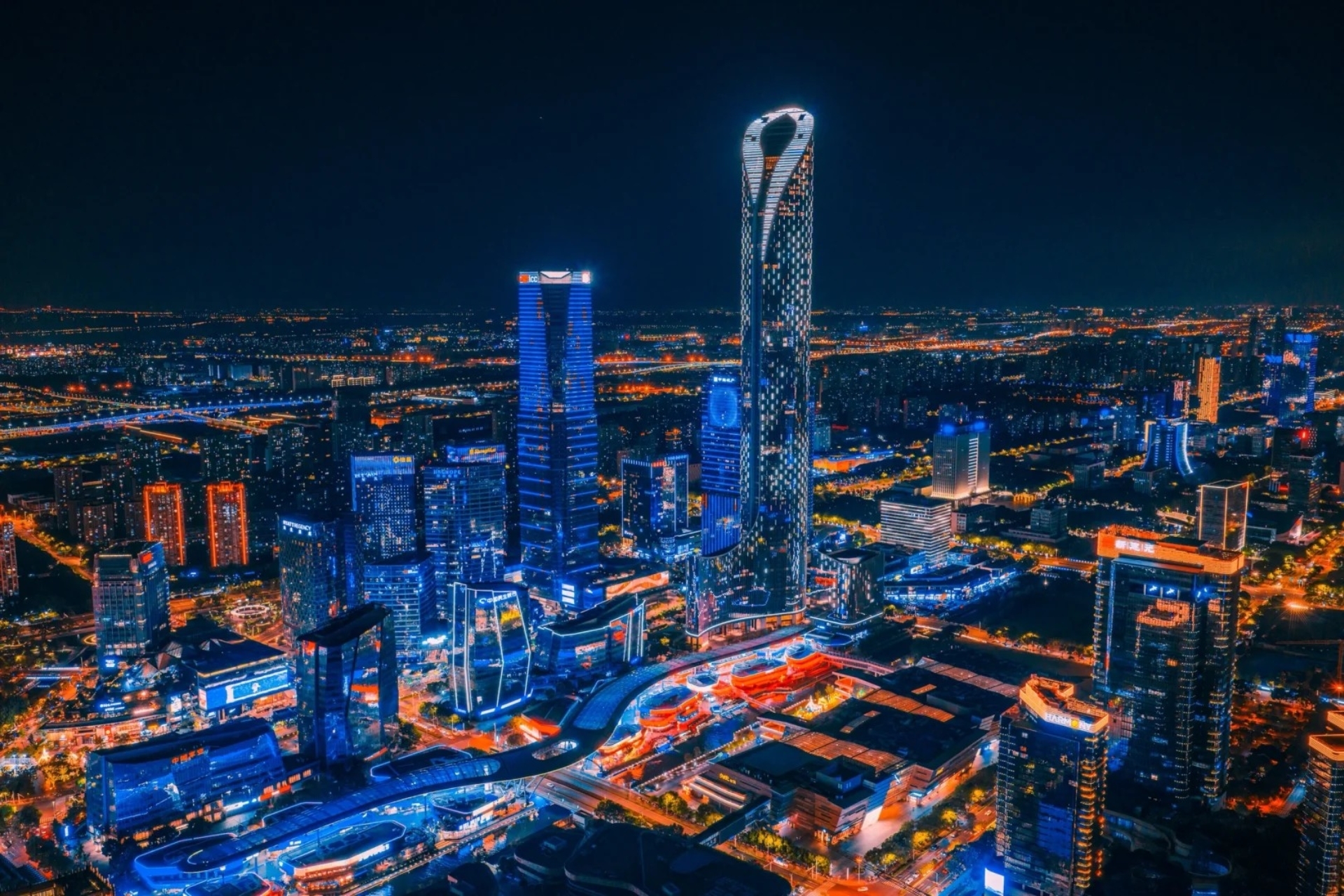 Cœur du Suzhou moderne : grands boulevards, centres commerciaux, promenade au bord du lac.